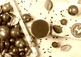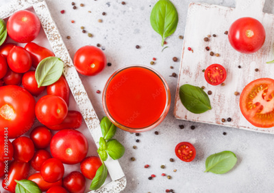 Glass of fresh organic tomato juice with fresh raw tomatoes basil and pepper in box on stone kitchen background