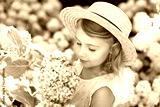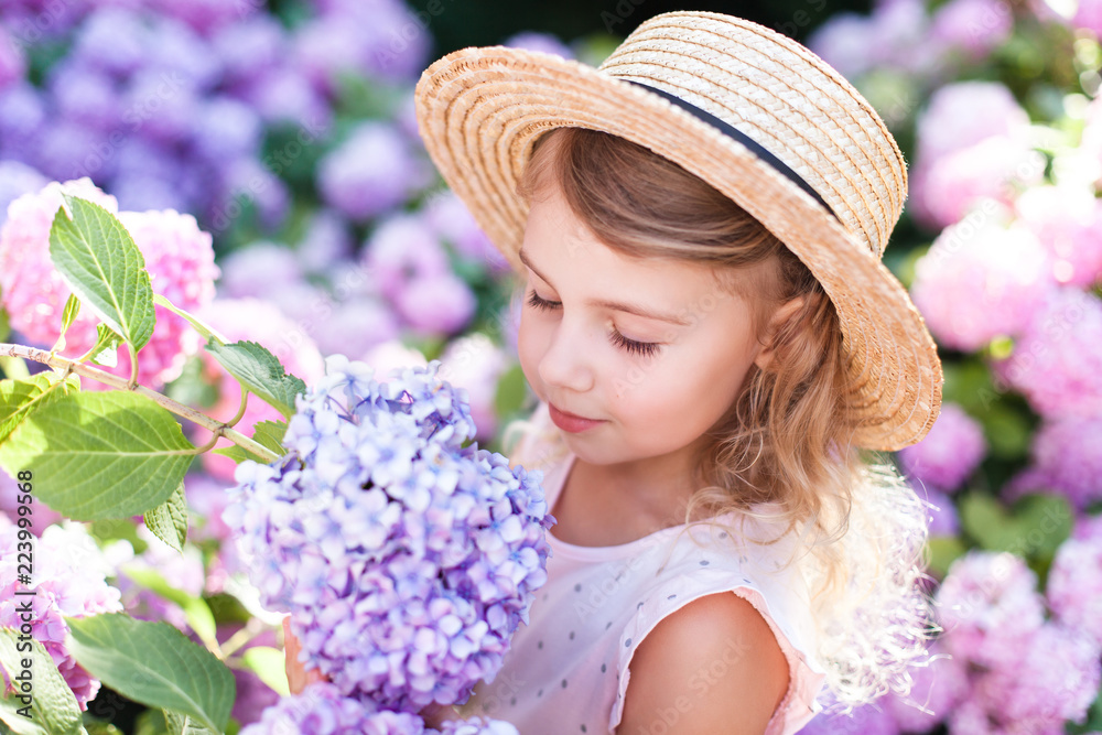 Little girl smells bushes of hydrangea flowers in sunny garden.