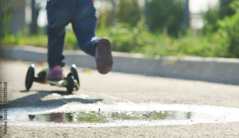 the child on a scooter close-up rides through puddles and splashes water drops in the rays of the sunset of the autumn sun
