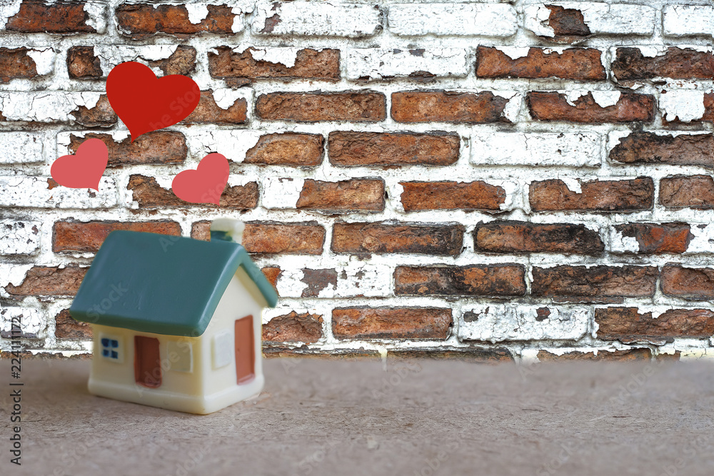 Miniature house with heart sign and blur brick wall background ,love family concept.