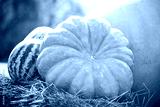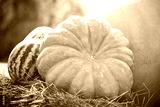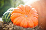 Big pile of pumpkins on hay in a wooden cart the season of harvest. Happy Thanksgiving Day. Harvest festival.