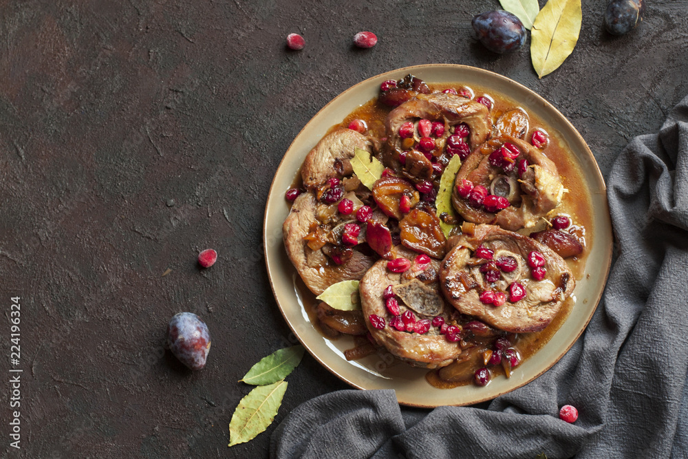 Osso buco from turkey bird with cranberries, plums, with red wine and honey sauce
