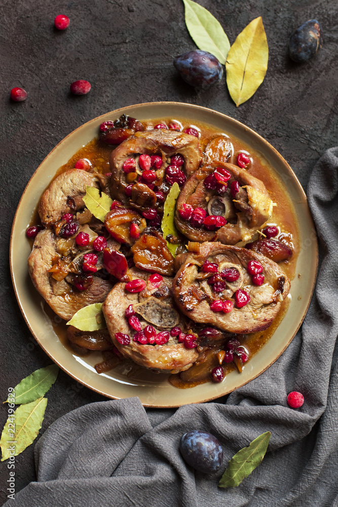Osso buco from turkey bird with cranberries, plums, with red wine and honey sauce