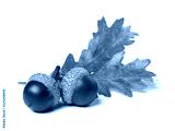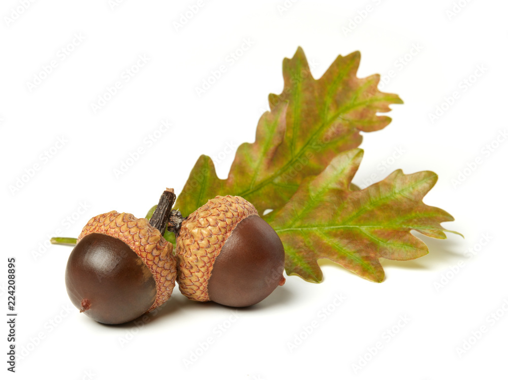 Acorns and oak leaves isolated on white