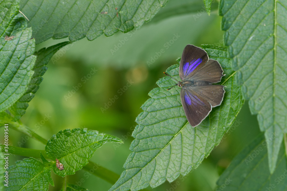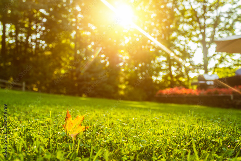 Fall color tour and fallen colored leaves in the grass in backyard with sunset through trees.