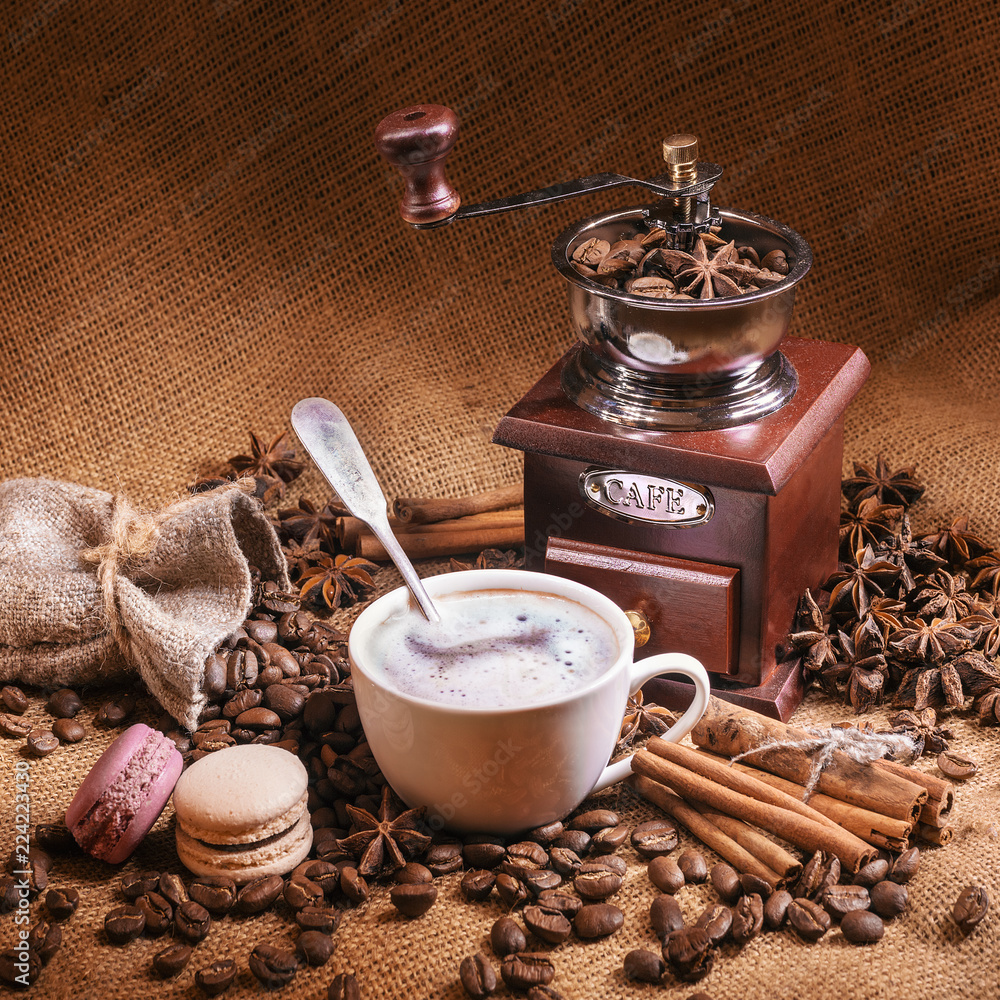 Cup of coffee with cookies macarons and coffee beans. Vintage still life. Concept.