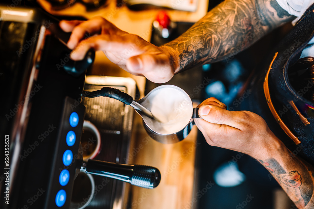 Professional barista steaming milk in cafe. Preparation of cappuccino