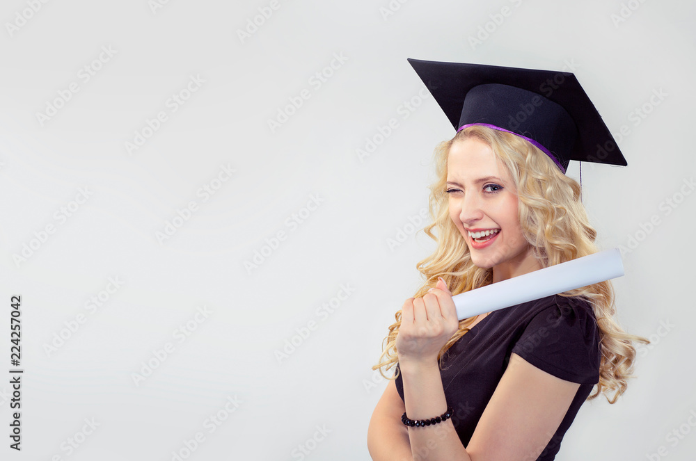 graduate student girl winking holding diploma