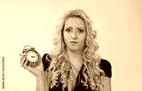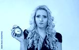 worried woman looking at camera and holding alarm clock
