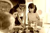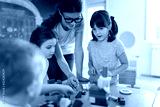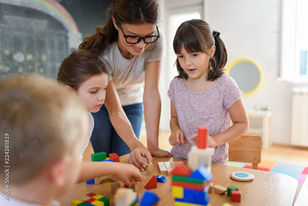 Preschool teacher with children playing with colorful wooden didactic toys at kindergarten