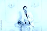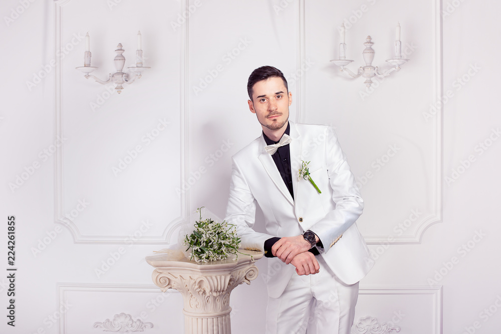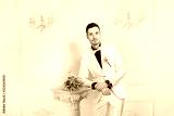 Smiling content man with bouquet of bride