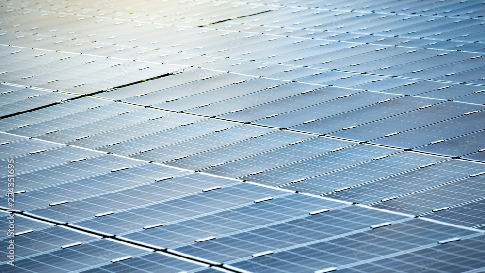 Rows array of solar panels or polycrystalline silicon solar cells in solar power plant using sunlight energy to generate electricity. Photovoltaic modules for renewable energy