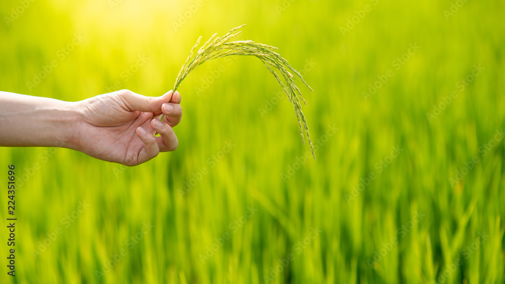 Male agronomist hand holding rice spike in green rice field. Cereal plant cultivation. Agriculture, nature and food concept