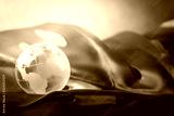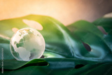 World globe cystal glass on green lush leaf. Environmental conservation. World environment day. Global business for sustainable development. Nature and ecology concept.