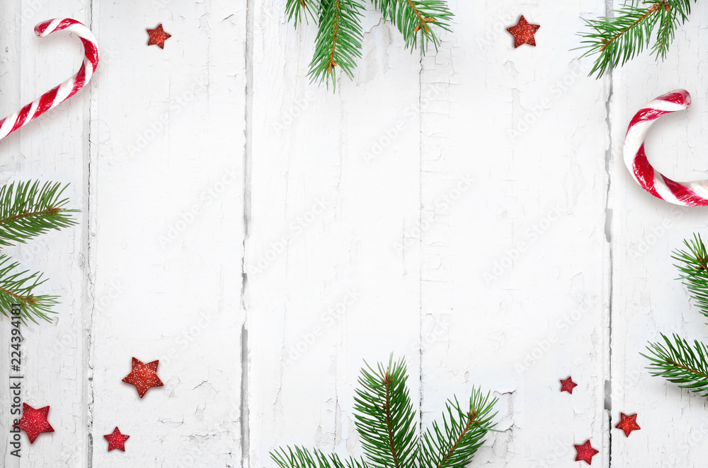 Christmas composition. Christmas gift, candy cane and fir tree branches. Top view, flat lay.