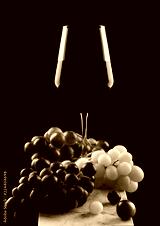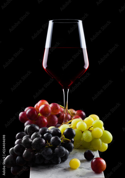 Elegant glass of red wine with dark and red and green grapes on wooden board on black background.