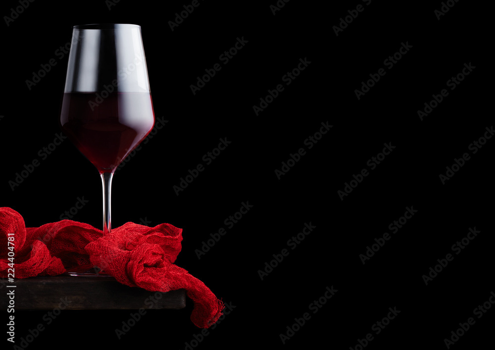 Elegant glass of red wine with red vintage cloth on wooden board on black background. Space for text