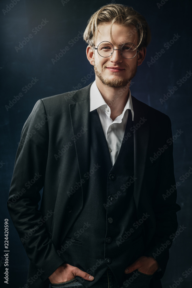 Waist up studio portrait of young confident handsome happy smiling man, businessman wearing round glasses, classic white shirt, black jacket, vest, posing on dark background, looking at camera