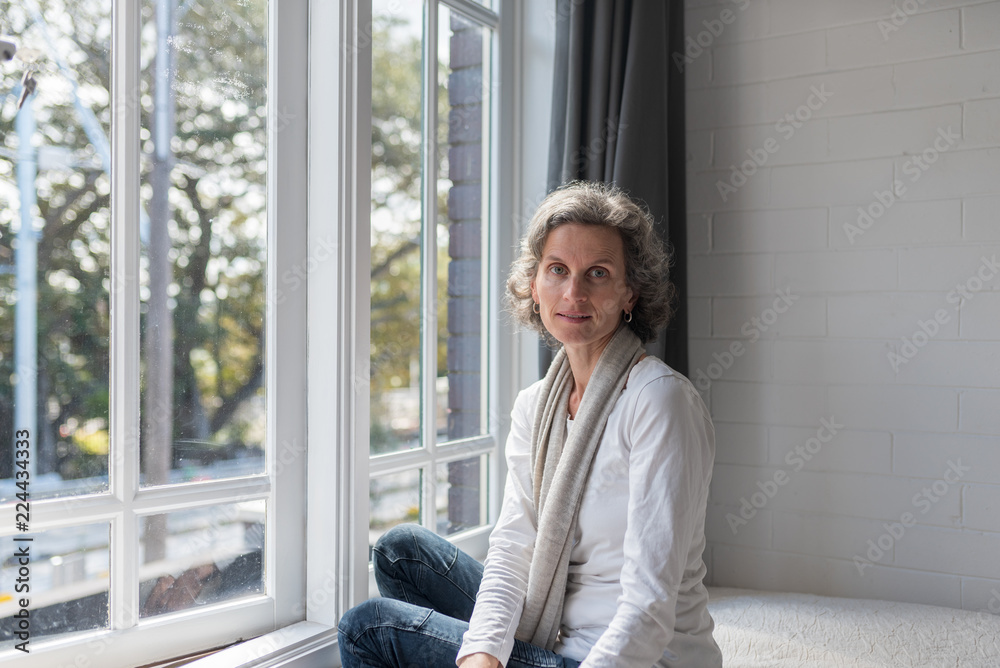 Portrait of beautiful middle aged woman sitting by window with tree outlook (selective focus)