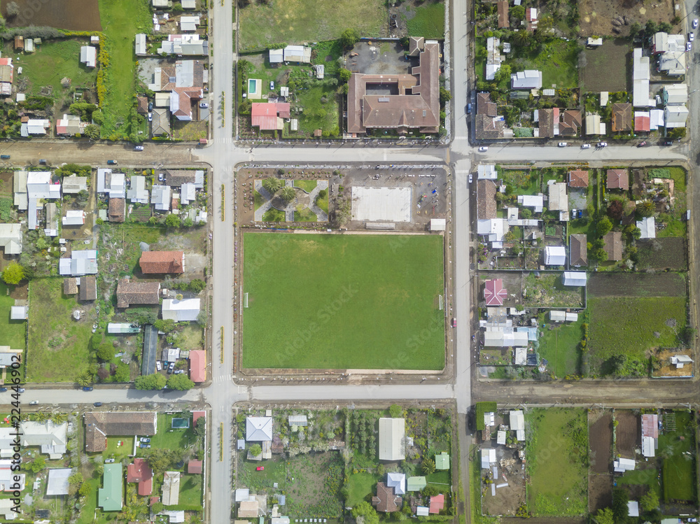An aerial view of Chile countryside from the drone, a small grass football field as the Main Square inside a new and symmetrical urban planning of the streets in the town of Buchupureo, Chile