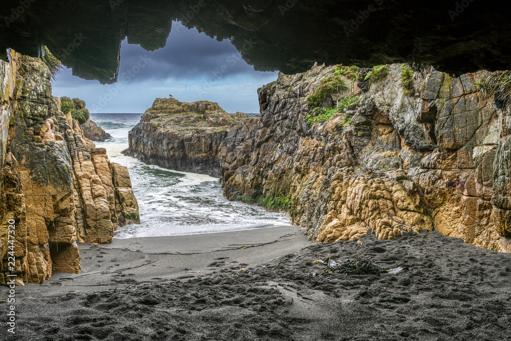 The famous travel destination of "Arcos de Calan", a magical name for a magical place with two natural stone archs in the cliffs over the Pacific Ocean. Mysterious place in a dramatical view, Chile