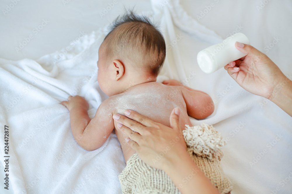Mother applying Talcum powder to back of her infant baby boy on bed.