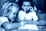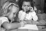 dissatisfied african american kid looking at caucasian child drawing at table in kindergarten