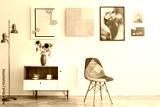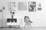 Colorful chair standing in white living room interior with gallery on wall, cupboard with flowers and tea cups in real photo