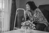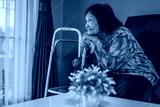happy senior woman with wooden cane in living room