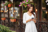 Cheerful female walking on city street enjoying free time on spring weekends