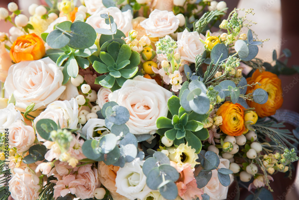 Bride`s wedding bouquet with roses befor wedding ceremony. Beautiful flowers background are pink, orange, white, yellow, green, cream.