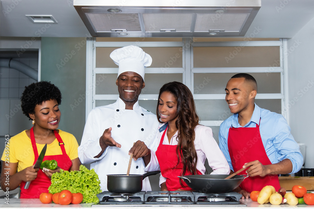 African american people learn cooking from chef