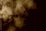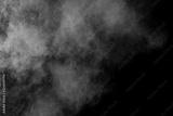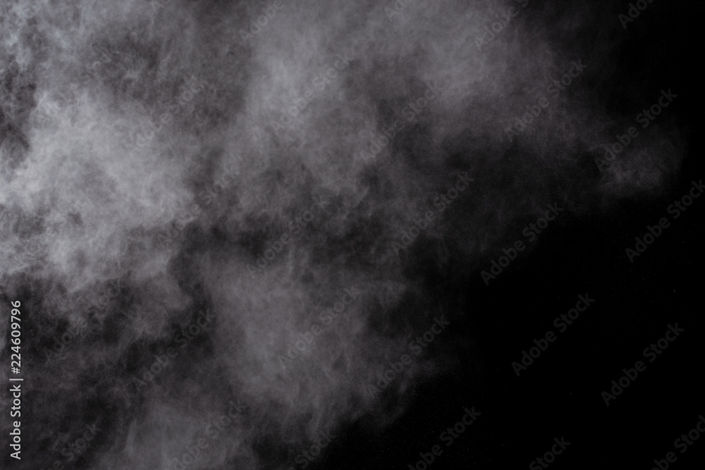 Freeze motion of white dust explosion on black background. Stopping the movement of white powder on dark background. Explosive powder white on black background.