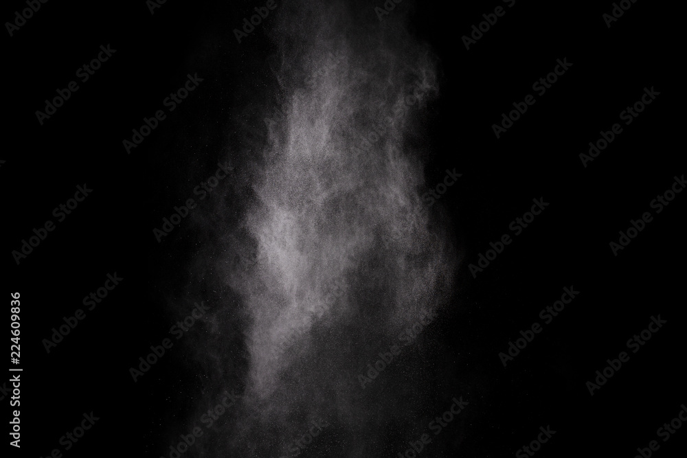 Freeze motion of white dust explosion on black background. Stopping the movement of white powder on dark background. Explosive powder white on black background.