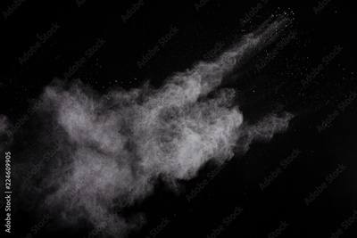 Freeze motion of white dust explosion on black background. Stopping the movement of white powder on dark background. Explosive powder white on black background.
