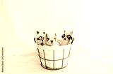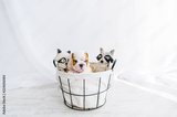 Puppy in a basket with soft toys. English bulldog six weeks old
