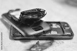 Mobile phone battery explodes and burns due to overheat. Danger, exploded mobile phone battery