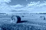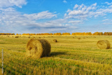 Picturesque autumn landscape with beveled field and straw bales. Beautiful agriculture background