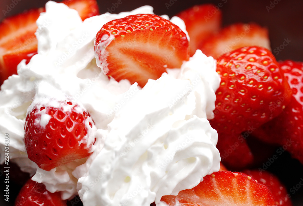 white whipped cream on red freshness sliced strawberry for dessert food background