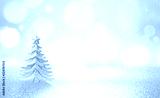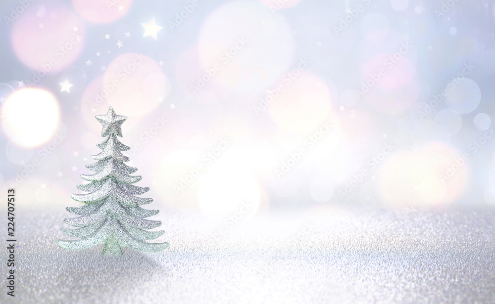 Winter christmas scenic background. Silvery small Christmas tree on a blurred snowy defocused background in blue and pink tones with copy space.