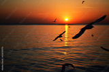 Silhouette of Seagull Birds fly through the seaside at sunset with copy space