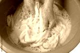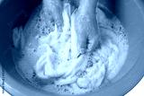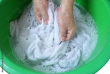 Hands washing white towel clothes with detergent in basin,selective focus.