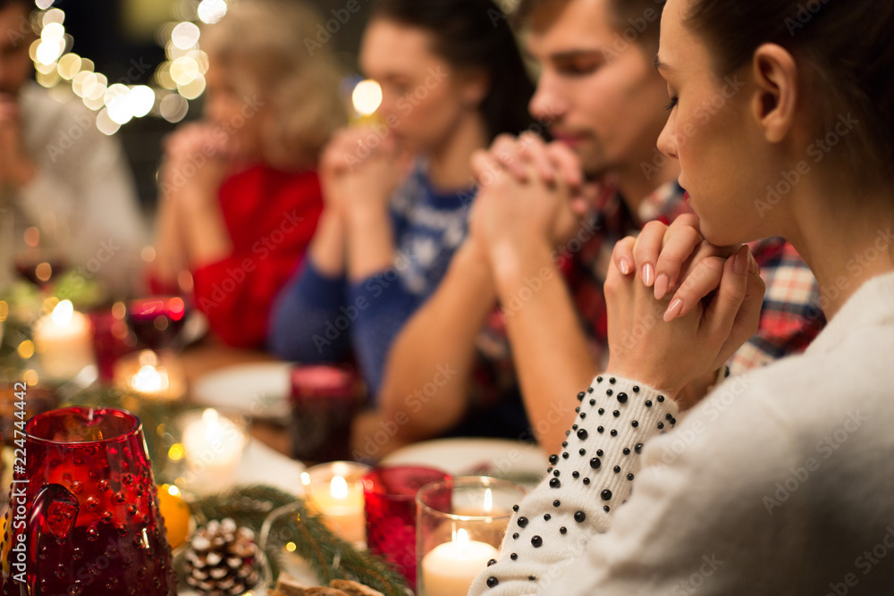 holidays and religious concept - close up of friends having christmas dinner and praying before meal