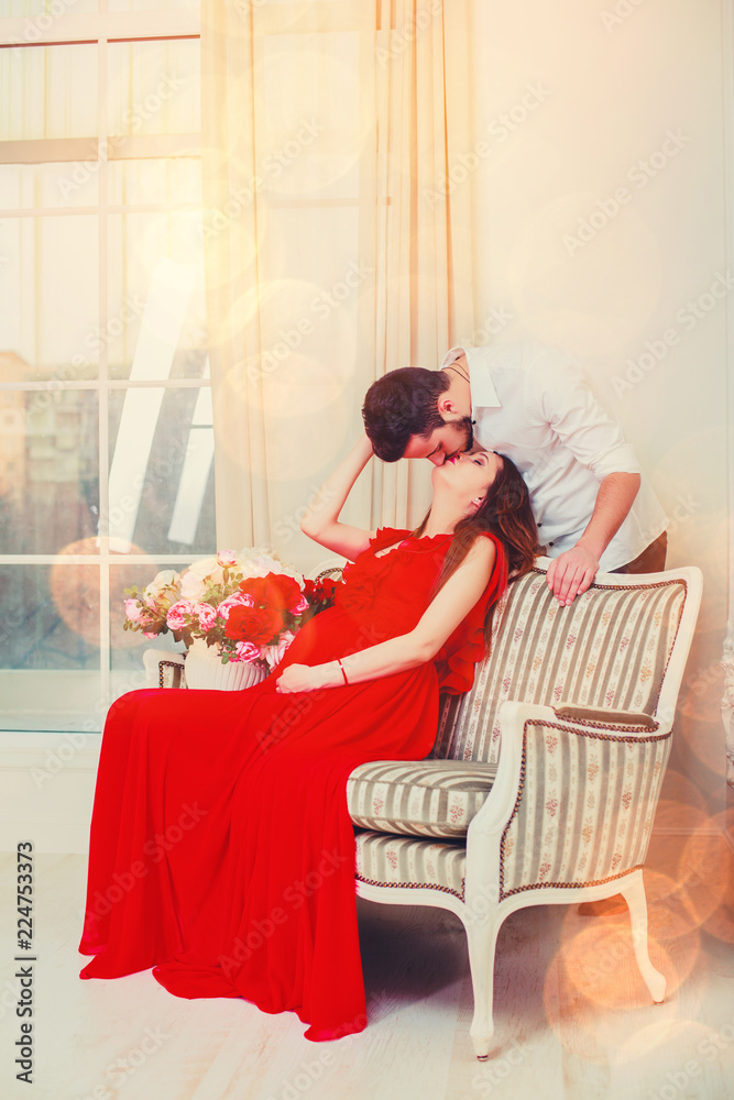 Happy couple kiss in the living room having, the light give a cozy atmosphere. Saint Valentine's day concept. Waiting for baby.