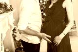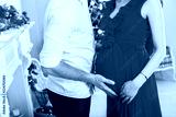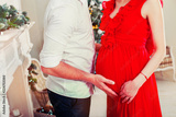 Happy family couple on Christmas at fireplace. Happy couple kiss and hugging. Living room decorated by Xmas tree and present gift