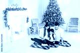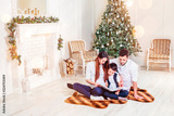 Happy family sitting in the living room having Christmas book, behind the decorated Xmas tree, the light give a cozy atmosphere.
