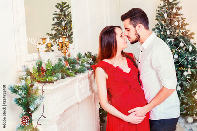 Happy couple kiss in the living room having, behind the decorated Christmas tree, the light give a cozy atmosphere.
