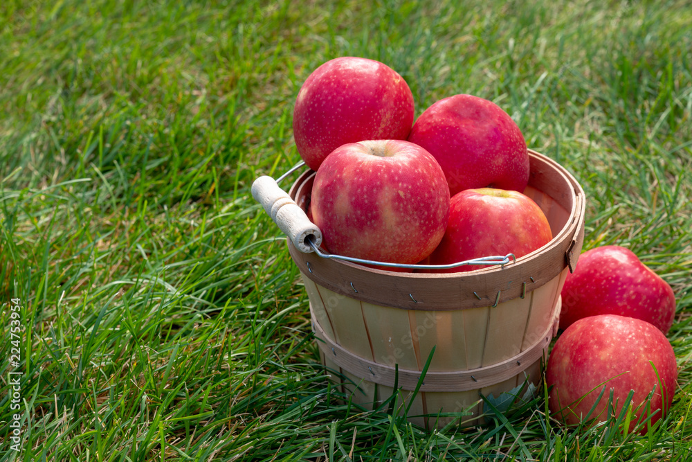 bucket of fresh picked red apples in grass