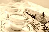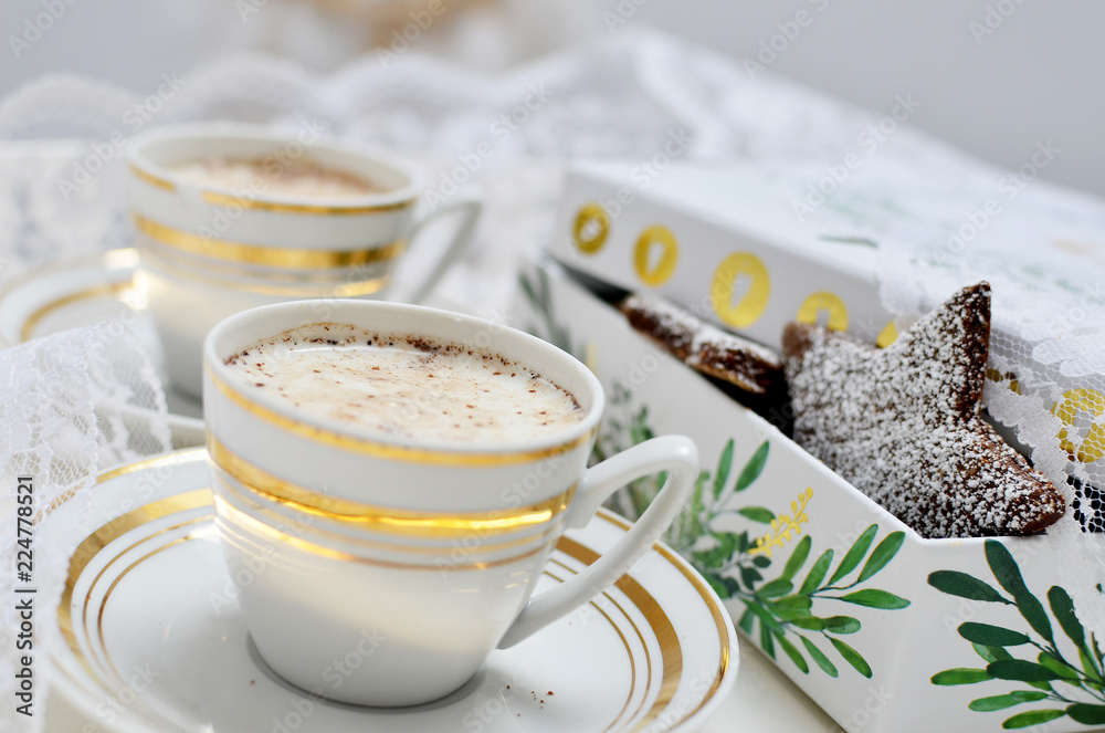 Cups of milk and cocoa on the table with gold elegant christams mood