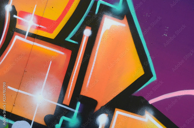 Fragment of graffiti drawings. The old wall decorated with paint stains in the style of street art culture. Colored background texture in warm tones